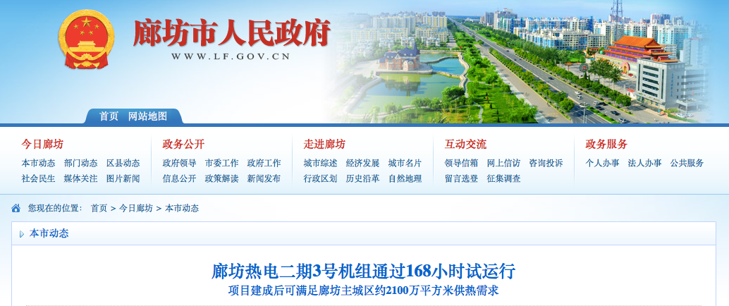 廊坊热电厂二期热电联产项目是河北省和廊坊市重点能源工程项目,建成后对解决民生供热需求,改善生态环境,促进清洁能源消纳,拉动地区经济社会发展和保障区域电力安全供应具有重大意义。