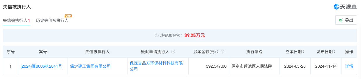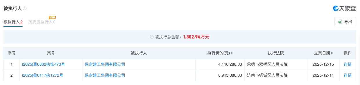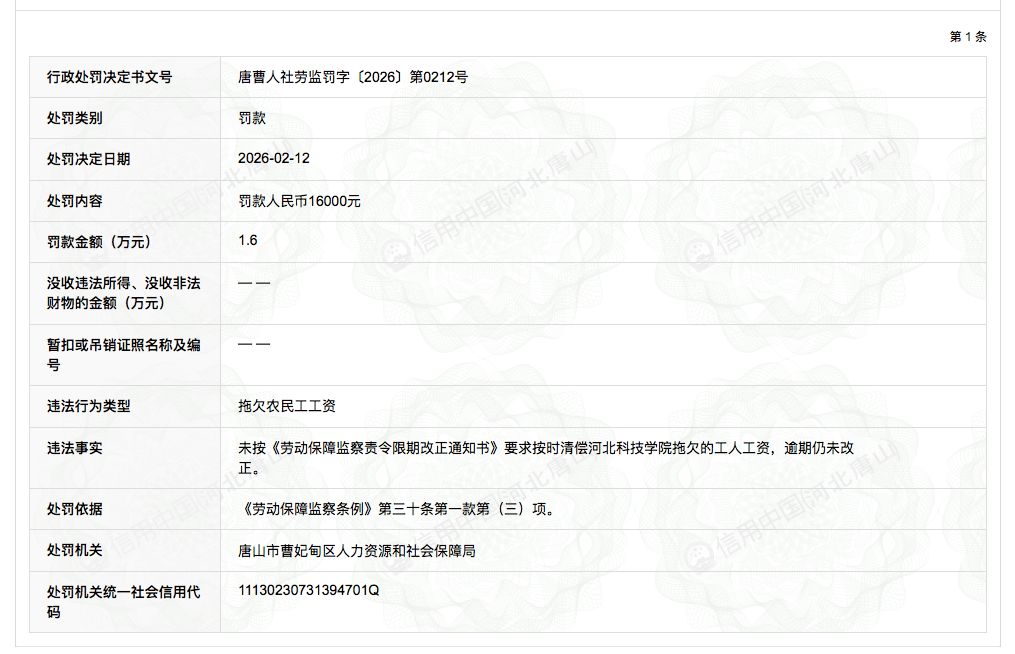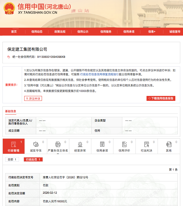 据信用中国(河北唐山)官网消息,2026年2月12日,因拖欠农民工工资逾期仍未改正,保定建工集团有限公司被唐山市曹妃甸区人力资源和社会保障局处以罚款1.6万元。