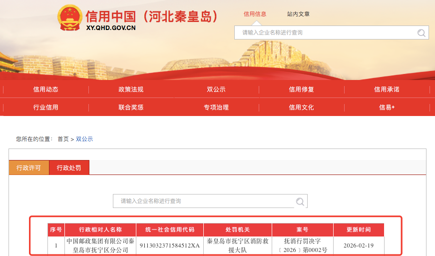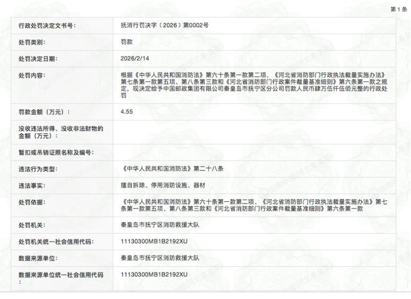 据信用中国(河北秦皇岛)官网公开信息,2026年2月14日,因擅自拆除、停用消防设施、器材,中国邮政集团有限公司秦皇岛市抚宁区分公司被秦皇岛市抚宁区消防救援大队处以罚款4.55万元。