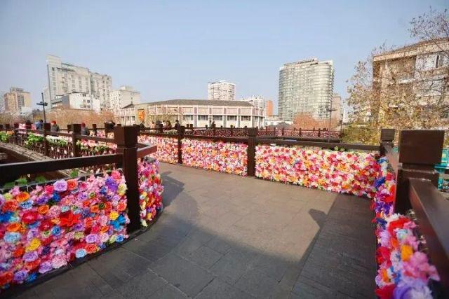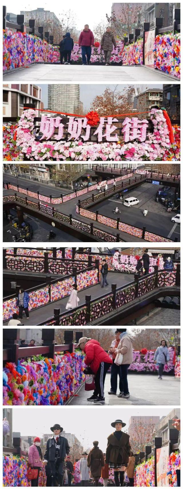 春节期间,位于解放路人行天桥的时尚街区“奶奶花街”悄然走红,天桥两侧,一块块色彩斑斓的花板沿桥两侧依次铺开,红色、粉色、黄色、蓝色、紫色层层叠叠,路过行人不自觉放慢脚步欣赏。