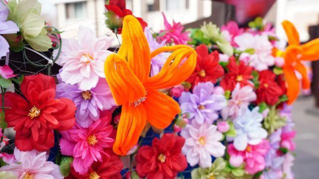 谁能想到,这片“时尚花街”背后的主创团队,竟是一群平均年龄70岁的奶奶们。她们憋了三个月的“大招”,用1.5万余朵仿生花手搓一片花海。从最初的创意构思,到图案设计、样板打磨,再到一针一线的手工制作,全部由百余位银龄志愿者亲手完成。