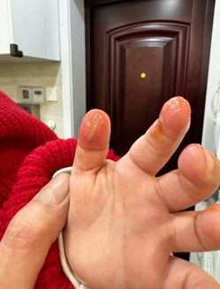 妈妈说,她前一天晚上带孩子在小区里玩,看到别的小朋友都在玩“仙女棒”,想着它不像别的烟花那么“凶”,就也给孩子买了一盒。没想到才转身一会儿,就听到孩子的哭声,回头看见孩子的手指碰到了燃烧的仙女棒,已经红肿起泡了。
