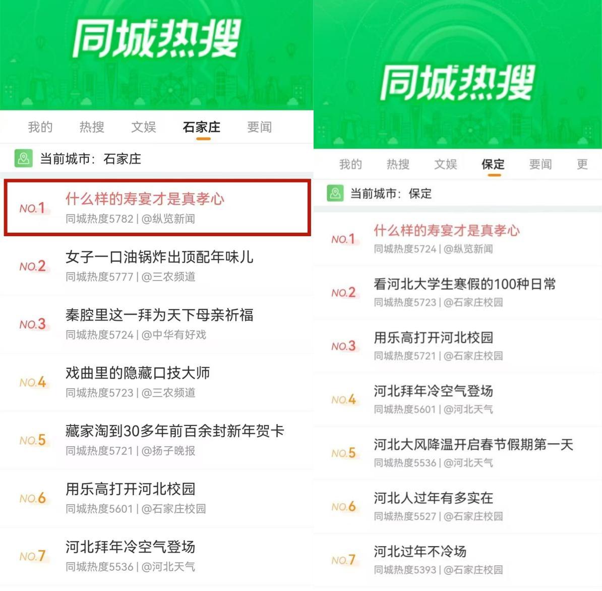 图为作品话题登上石家庄、保定两地同城热搜榜首截图。