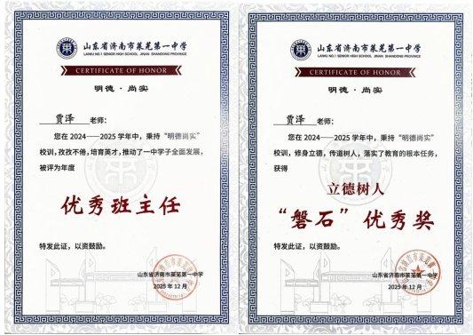 不负韶华,不负耕耘。2025年高考,贾泽所带班级交出了一份亮眼答卷:全班全员过本科线。在“提高一分,干掉千人”的高考战场上,他用三年如一日的坚守,兑现了“一个都不能少”的承诺,用实力书写了育人华章。这份成绩的背后,是无数个清晨的守候,是无数个夜晚的陪伴,是无数次谈心时的耐心倾听,是每次考试后的细致分析。贾泽荣获校级“优秀教师”“优秀班主任”“立德树人磐石优秀奖”,所带班级荣获“济南市优秀班集体”称号。这些荣誉,是对他三年付出的最好肯定,更是对这个团结奋进的集体的至高褒奖。