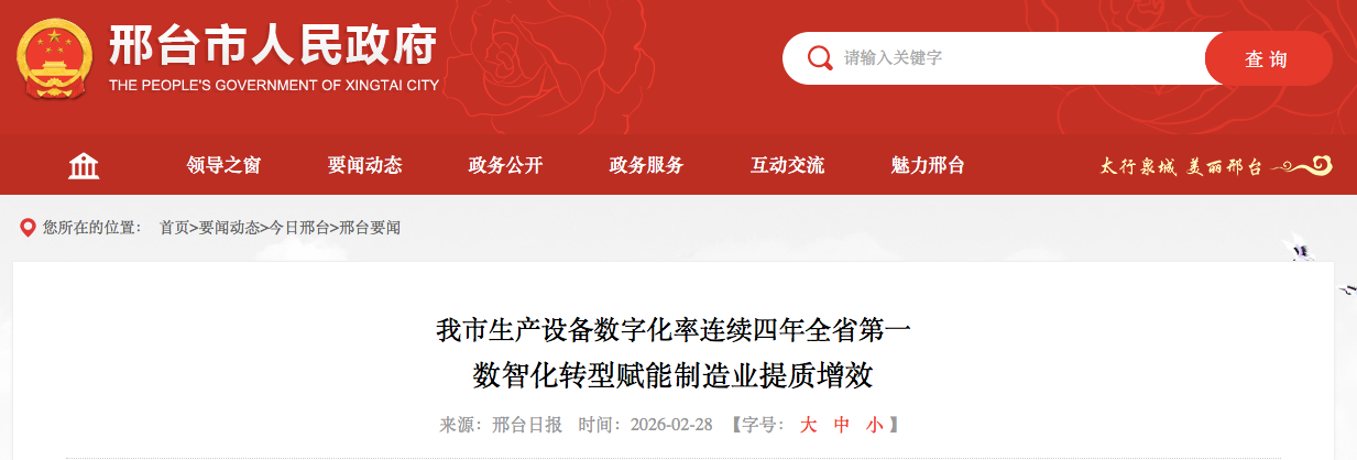 近年来,邢台市推动企业梯次数字化转型,推进“人工智能+制造业”融合发展,完善工业互联网平台体系,深化“5G+工业互联网”应用,健全服务体系,加快制造业数字化转型步伐。全市工业企业两化融合发展水平从2021年开始,实现四连增,生产设备数字化率,连续四年保持全省第一位,关键业务环节全面数字化的企业比例,连续四年保持全省第二位。