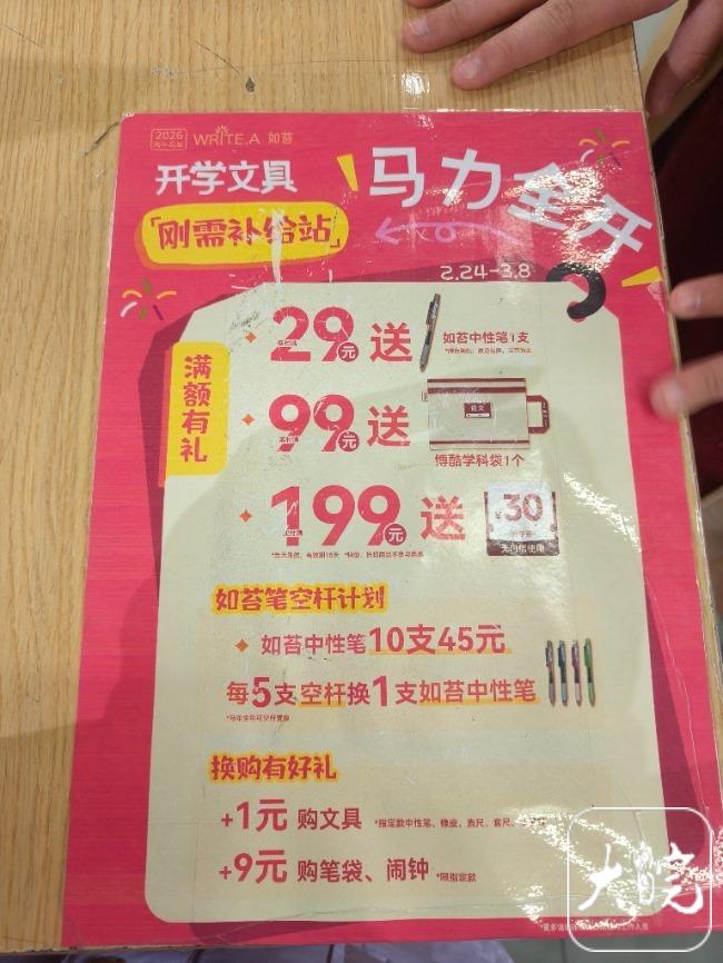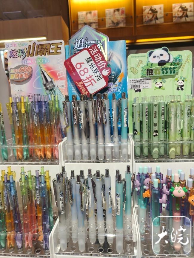 “这个区域的笔是6.8折,那边的活页本两件打8折,都可以挑一挑。”店员告诉记者,门店目前的品类齐全,基础文具销量较平日大幅增长,“我们满额的礼赠已经全部送完了。”