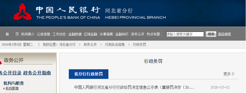 2026年3月2日,中国人民银行河北省分行公布了一则对中国农业银行股份有限公司河北省分行(以下简称“农业银行河北分行”)的行政处罚信息。