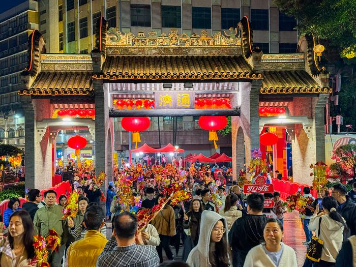 不远处,市民苏先生一家三代同行,场面温馨。他自幼随父母行通济,如今已为人父,怀抱着年幼的孩子,身边跟着七旬父母。“九出十三归,这是老一辈传下的讲法,希望新年大家发大财,万事顺意。”苏先生说,行通济对他而言是每年闹元宵的仪式,也是一种传承。“现在带孩子来,就是要让他从小知道,这是佛山人元宵必做的事。”