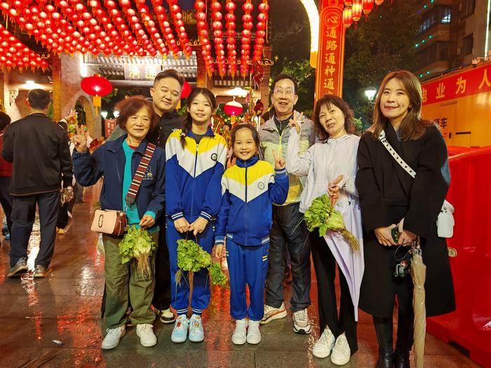 “排除万难走过来,雨过天晴,越夜越兴旺。”潘先生一家七口特意从广州荔湾驱车赶来,恰逢雨势稍歇。作为每年元宵的固定行程,他们手持风车、提着生菜,循着“行通济,冇闭翳”的古训,由北向南缓步走过。对他而言,这短短几十米的桥,连接的不仅是佛山与广州的地域,更是对新一年最美好的期盼。