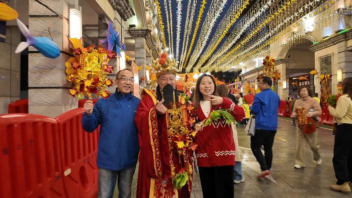 桥上的惊喜远不止于此。一位装扮成“财神爷”的市民罗先生穿梭在人群中,免费与大家合影,送上祝福。他身着红袍,手持金元宝,憨态可掬。“行通济,冇闭翳,祝大家准备上桥就遇财神,财源滚滚!”罗先生说,他这么做是为了更好地将佛山传统文化宣传出去,让全世界朋友都见到佛山人的热情和好意头。