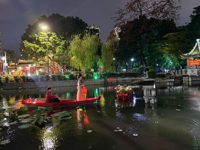 夜色渐深,通济桥下水面忽然亮起璀璨灯火。一场水上沉浸式演绎“洛水泛舟”正在上演。佳人泛舟,船夫相伴,瞬间将人带入如梦似幻的江南仙境。桥上人潮驻足观看,喝彩声此起彼伏。古老的民俗与现代的演绎,在这座桥下完美交融,将元宵喜庆氛围推向高潮。