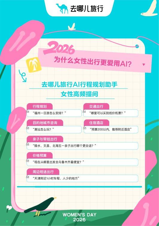 此外,使用去哪儿旅行AI行程规划助手的女性用户占比也超过6成,她们也表现出了更高的使用活跃度。从行程规划、交通出行、目的地咨询,到住宿选择、价格预算、周边短途安排,女性用AI应对旅途中的不确定性,更从容地投入与自己相处的时光。