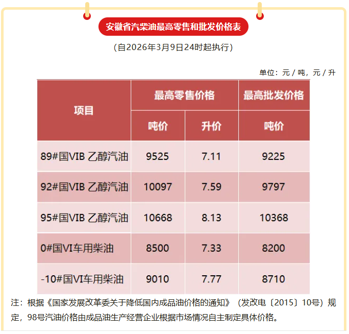 大皖新闻讯 据安徽发展改革委微信号3月9日消息,根据国家发展改革委通知,2026年3月9日24时起,成品油价格上调,安徽省同步实行。调整后92号汽油为7.59元/升,95号汽油8.13元/升,0号柴油7.33元/升,按一般家用汽车油箱50升容量估测,加满一箱92号汽油约多花27.5元。