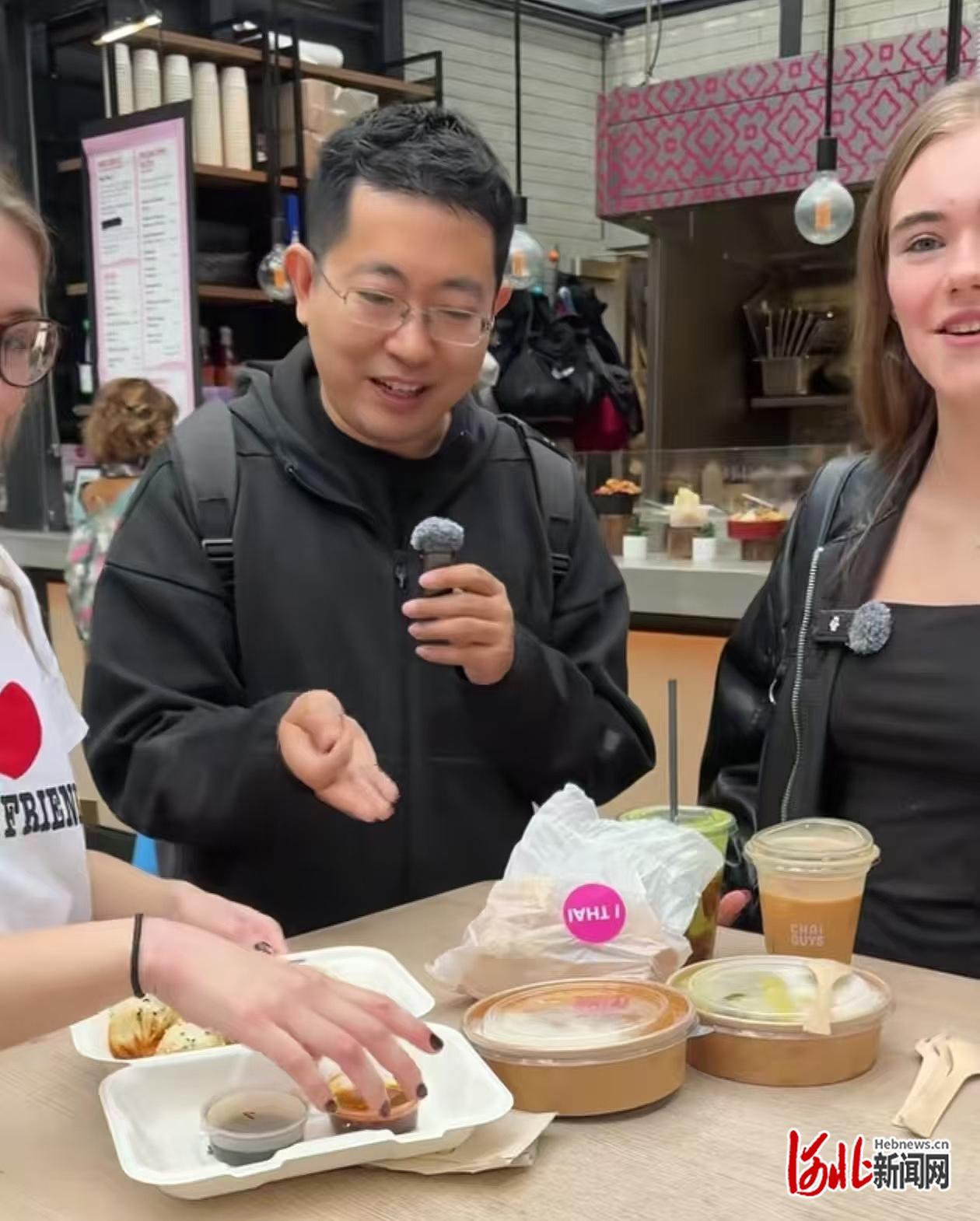 2025年8月21日,李念在英国与外国人互动并介绍中国美食。(来源/视频截图)