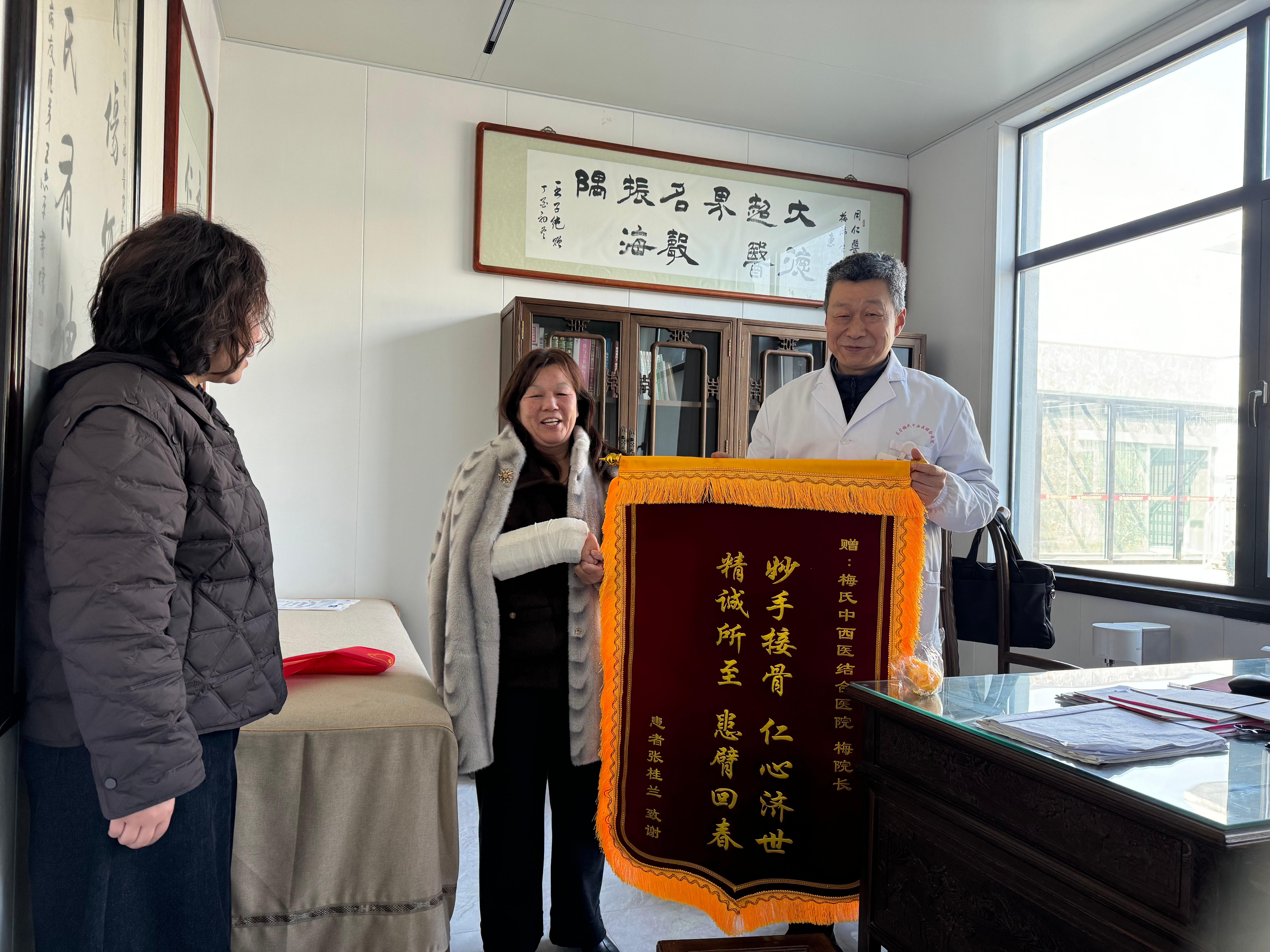 “梅院长,真是太感谢您了!我这手,现在一点都不疼了,恢复得这么好。”3月13日上午10时许,东台梅氏中西医结合医院门诊骨伤科一室,张女士脸上满是欣慰的笑意。一旁的女儿小心翼翼地递过一面鲜红的锦旗,郑重地交到正忙着检查张女士手臂的医院院长梅沛生手中。锦旗上“妙手接骨 仁心济世 精诚所至 患臂回春”十六个大字。