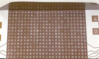 刚进门的墙壁上是横向25字、纵向15字的幕墙设计,细看有《月亮与六便士》《不能承受的生命之轻》等名著的书名,也有孔子、庄子等名人,还有不少地名,这些名称以横向或纵向方式排列。