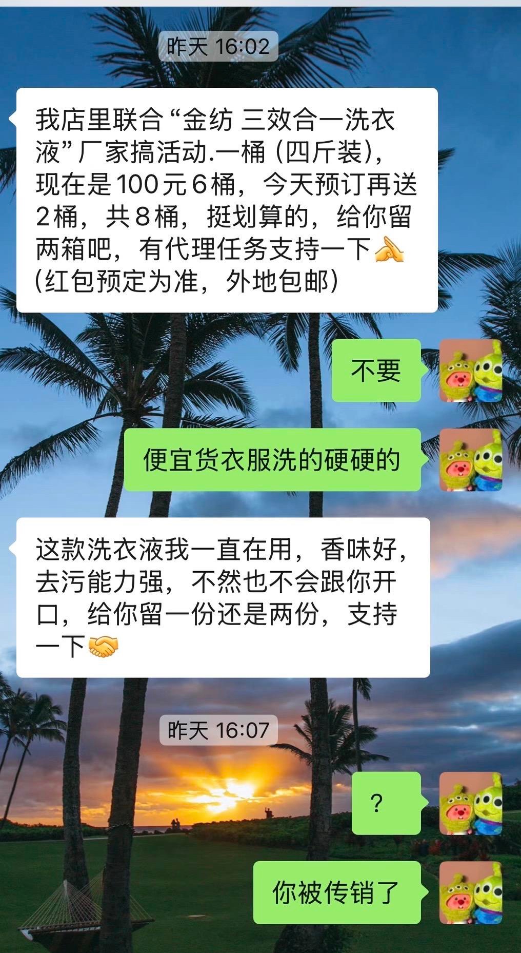 最近,小晨(化名)向记者反馈,最近被自己微信好友的洗衣液推销给“狂轰滥炸”了。“有两个现实中都认识的朋友,用一模一样的话术,让我支持他的副业,称100元8桶,白猫洗衣液,好闻好用,两天收到了十几条,两人发来的文案一字不差,就像进了新的传销组织一样。”
