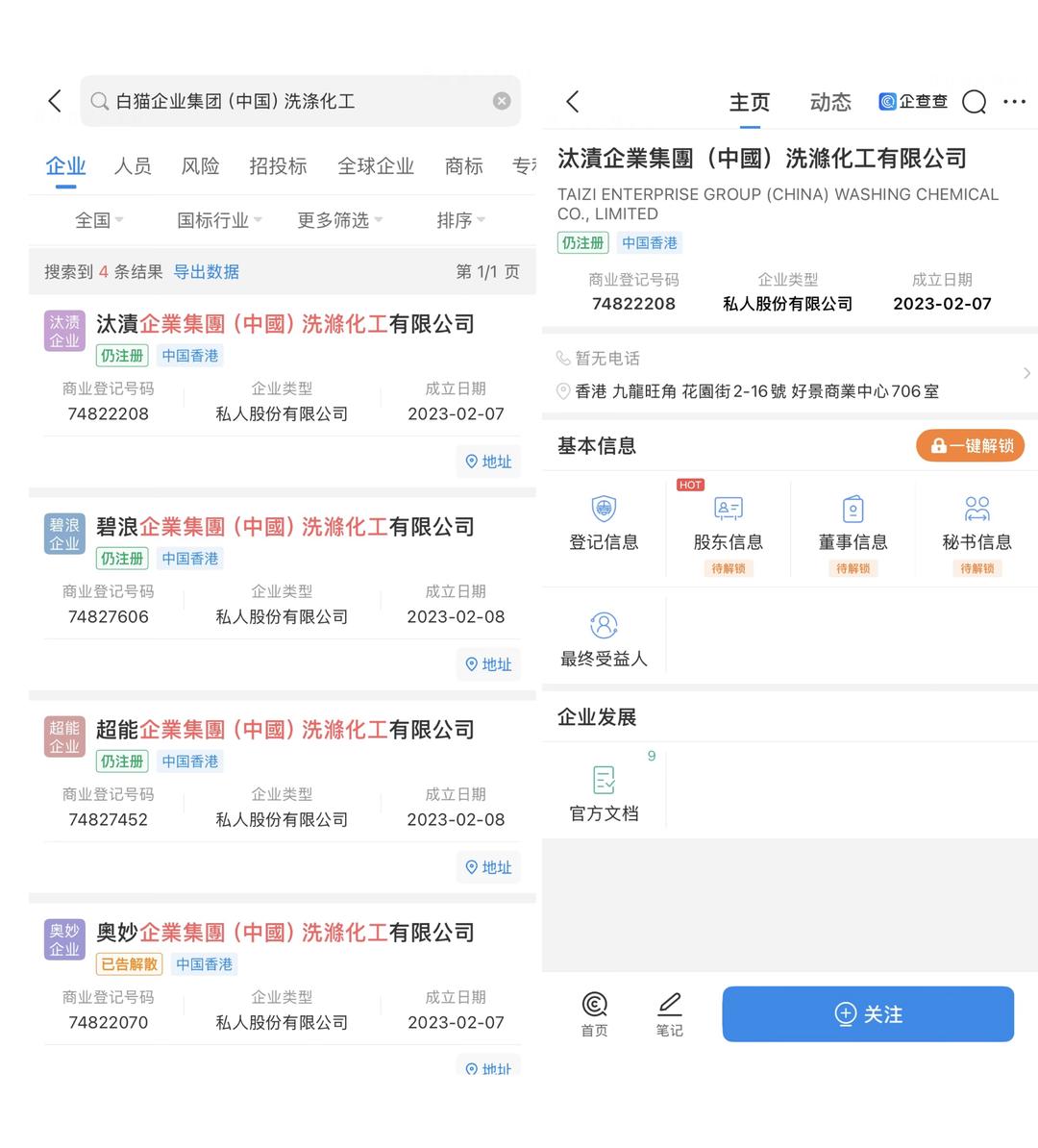 说着,方圆给记者发来图片,称这是白猫集团生产的洗衣液,记者企查查搜索洗衣液包装印制的“白猫企业集团(中国)洗涤化工有限公司”,发现公司信息并不存在,但出现了以“汰渍”“碧浪”“超能”“奥妙”为首的四家后缀名称完全一样的香港注册企业,更为巧合的是,四家企业先后在2023年2月8日前后成立,是既看不到法人姓名,也无企业联络方式的“幽灵公司”。