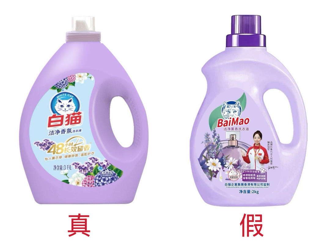 正品白猫洗衣液与仿冒款洗衣液外观对比