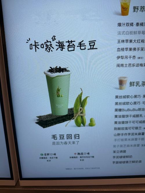 3月20日,新茶饮品牌百分茶推出春季限定创意饮品咔嚓海苔·青芥末毛豆干酪,同步上线无芥末基础款。24日,该品牌门店工作人员向记者介绍,此款是毛豆和冰块打碎后的冰沙类饮品,添加海苔碎,偏咸口,可以考虑个人的口味再决定购买。