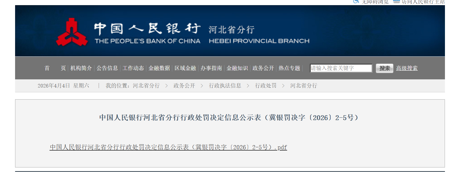 中国人民银行河北省分行决定对其给予警告,并处罚款190.37万元的行政处罚。