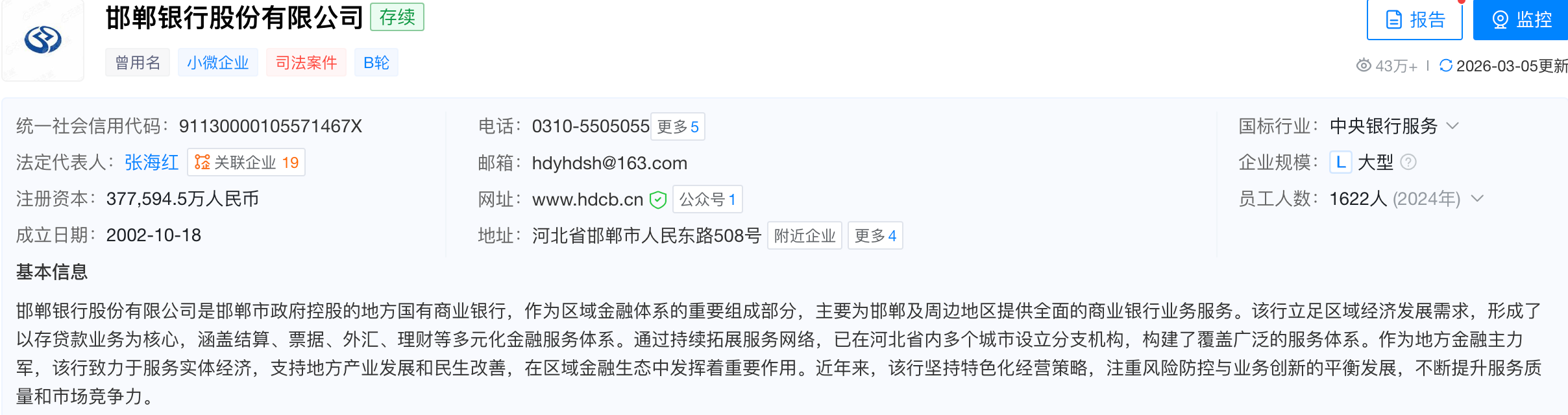 邯郸银行股份有限公司(曾用名:邯郸市城市信用社股份有限公司(未披露至2008-06)、邯郸市商业银行股份有限公司(2002-10至未披露)),位于河北省邯郸市,成立于2002年,是邯郸市政府控股的地方国有商业银行,法定代表人为张海红,统一社会信用代码为91130000105571467X。