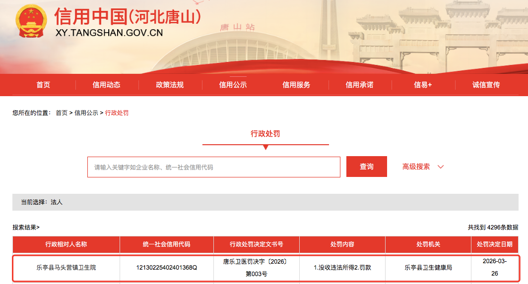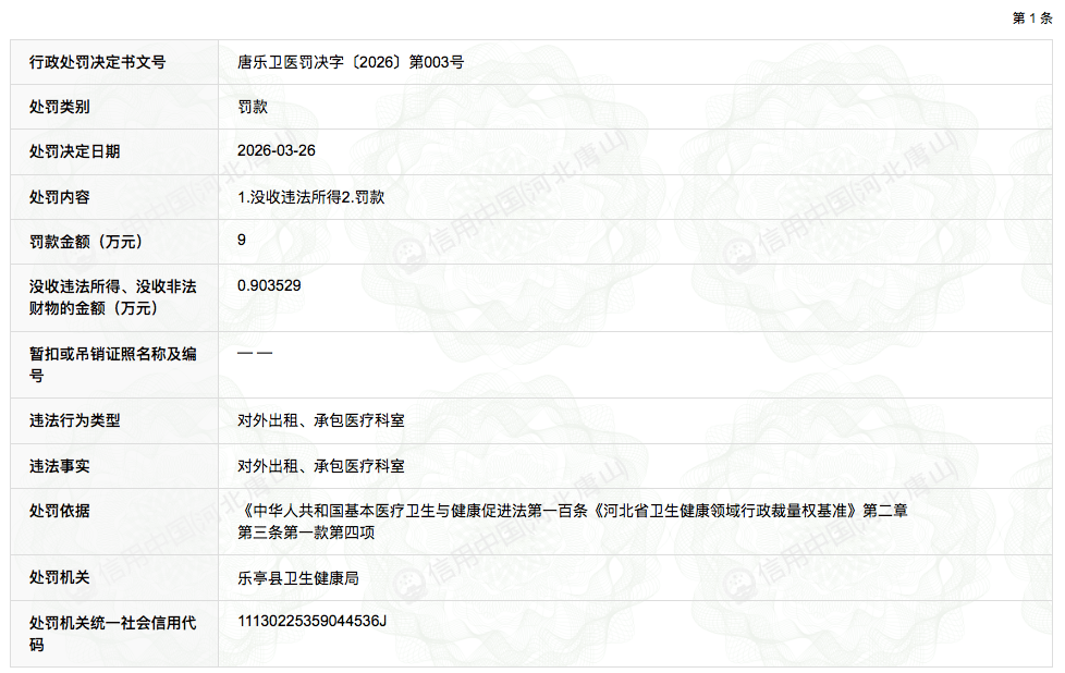 据信用中国(河北唐山)官网公示信息,2026年3月26日,因“对外出租、承包医疗科室”,乐亭县马头营镇卫生院被乐亭县卫生健康局处以罚款9万元,并没收违法所得。