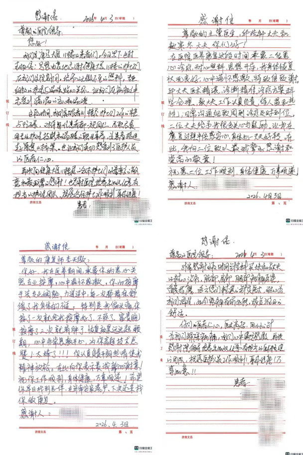 近日,济南南郊医院康复科收到了一份特殊的礼物——四封来自住院患者的集体感谢信。信中,患者们对李红梅主任带领下的康复科全体医护人员表达了真挚的谢意,既点赞了医生精湛的医术,又肯定了护理团队的悉心照料。