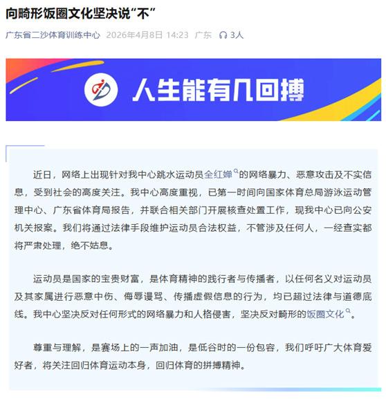4月9日,广东省二沙体育训练中心的一则声明,让体育舆论场中的畸形“饭圈”文化现象再次受到关注。针对跳水运动员全红婵遭受网络暴力一事,训练中心在声明中连用了两个“坚决反对”——坚决反对网暴、坚决反对畸形“饭圈”文化。