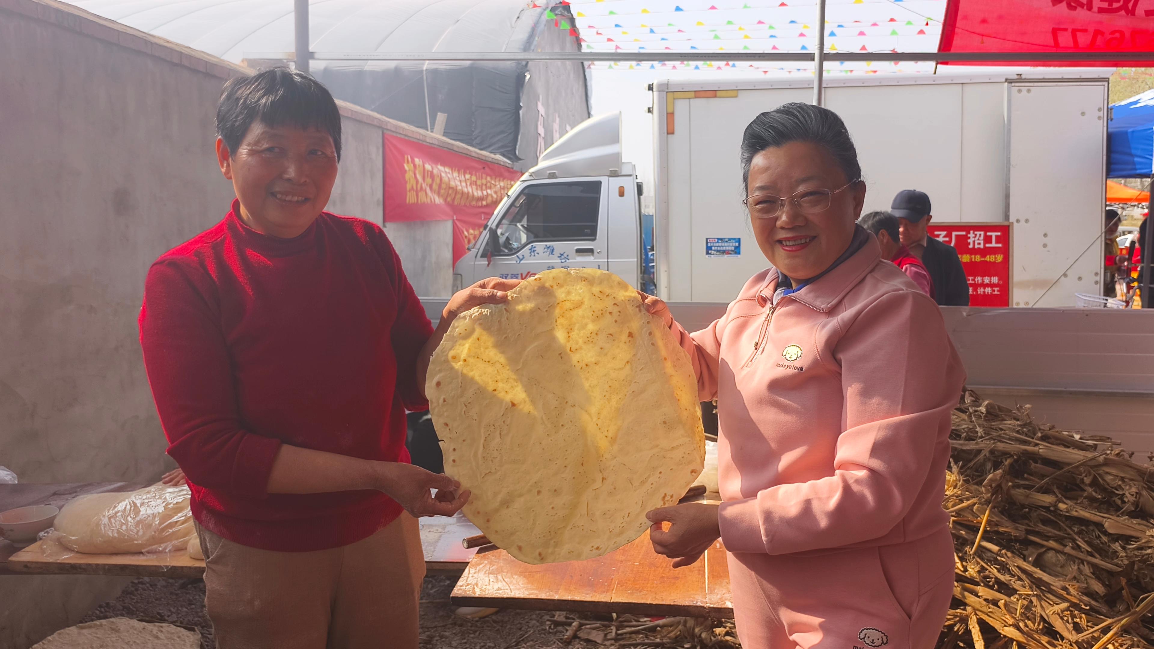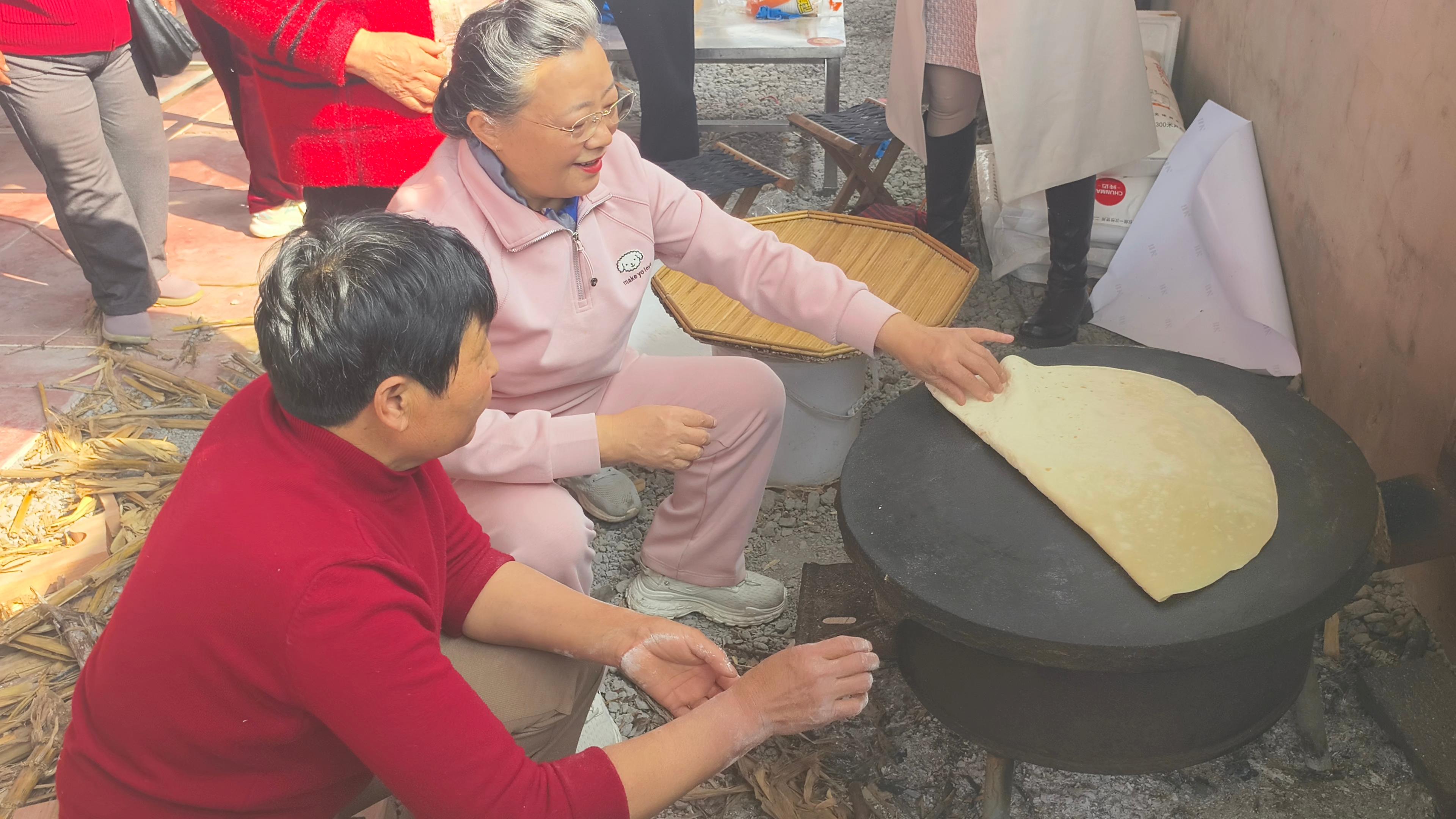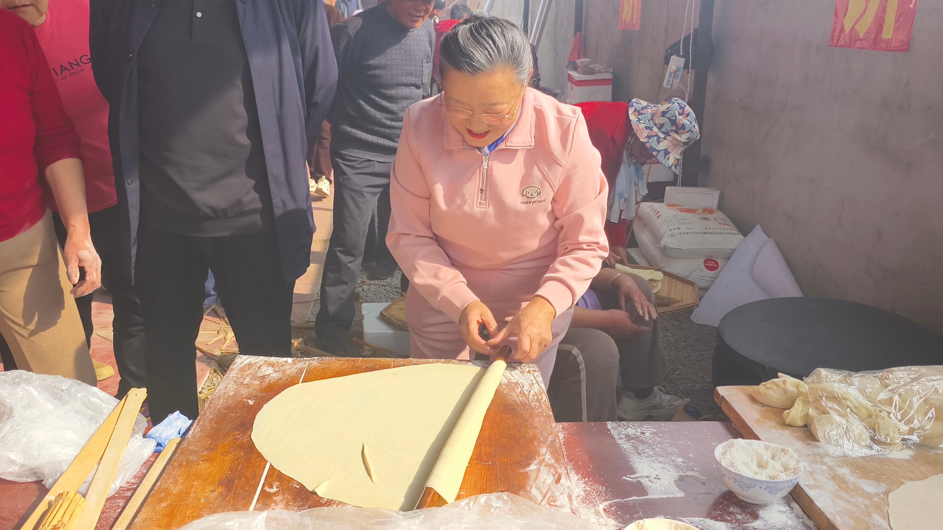 最热闹的,还是杜老师撸起袖子加入擀饼队伍。她和乡亲们围在案板前,揉面、揪剂子、擀薄饼,一边忙活一边拉家常。“这饼要擀得圆,日子才过得团团圆圆。”她学着大娘的手势,擀出的饼虽不太规整,却惹得一片欢笑。灶火映红了大家的脸,一张张薄饼出锅,卷上大葱和酱,咬一口,满是家乡的味道。