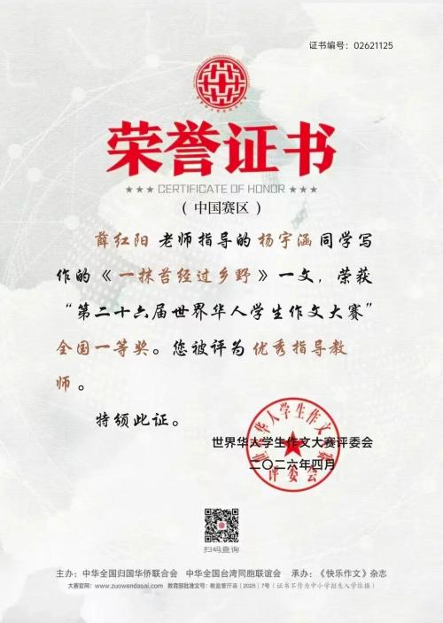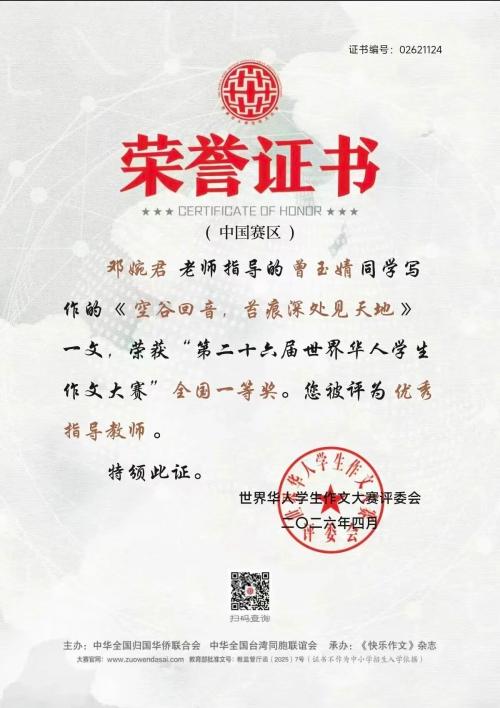 近日,第二十六届世界华人学生作文大赛获奖名单正式揭晓,横峰中学学子不负韶华、奋勇争先,在这项全国性权威赛事中喜获佳绩,用笔墨书写青春才情,为学校赢得荣誉、增添光彩。