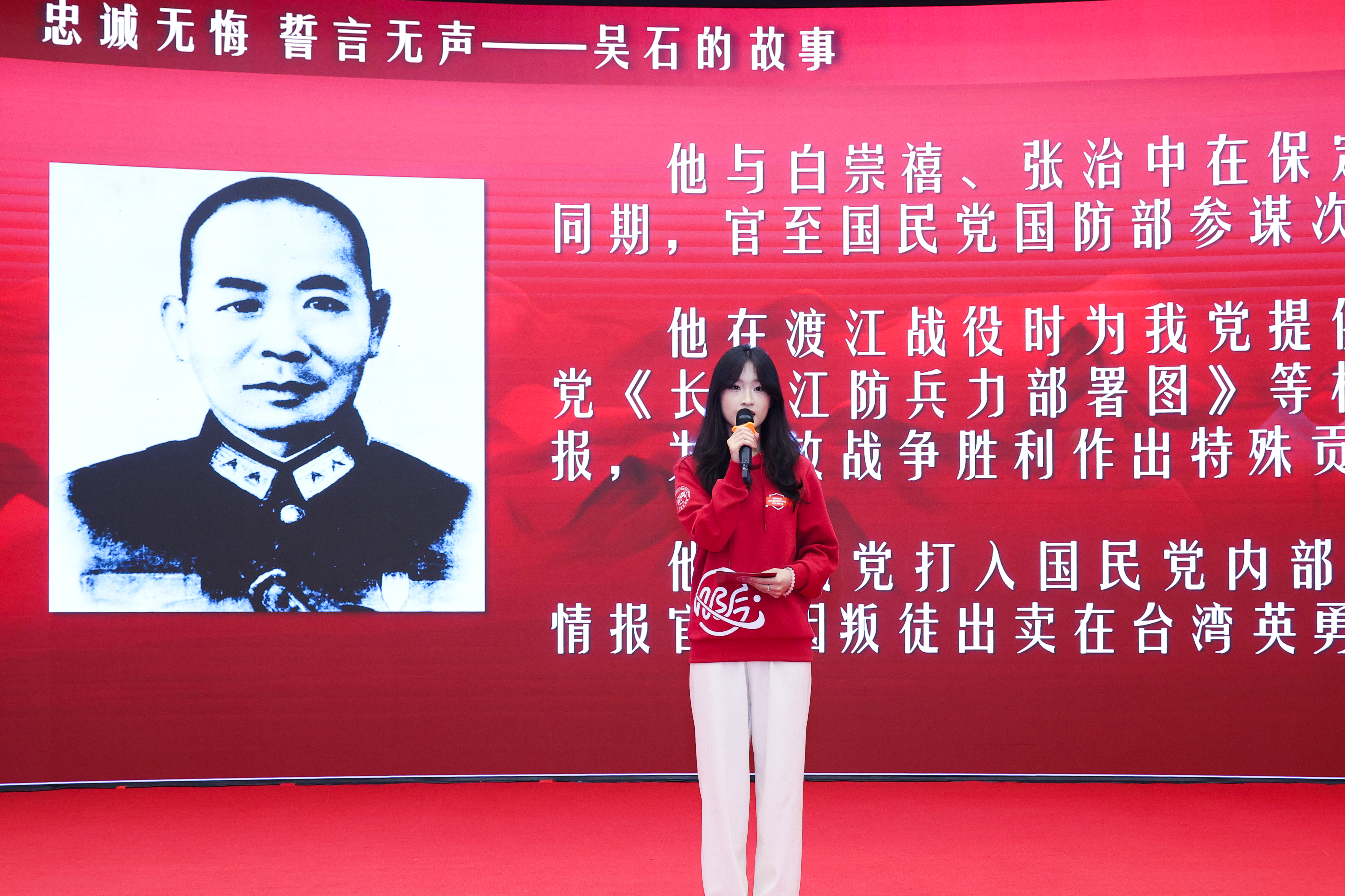 最令人动容的环节,当属讲述隐蔽战线英雄吴石烈士的故事。“若一去不回,便一去不回”,宣讲团成员蔡郁馨引用热播谍战剧《沉默的荣耀》中的台词,深情回顾了吴石烈士在台湾潜伏,冒死获取绝密情报,最终英勇就义的壮烈一生。当讲到吴石临刑前从容留下“凭将一掬丹心在,泉下差堪对我翁”的诗句时,现场鸦雀无声,不少同学红了眼眶。