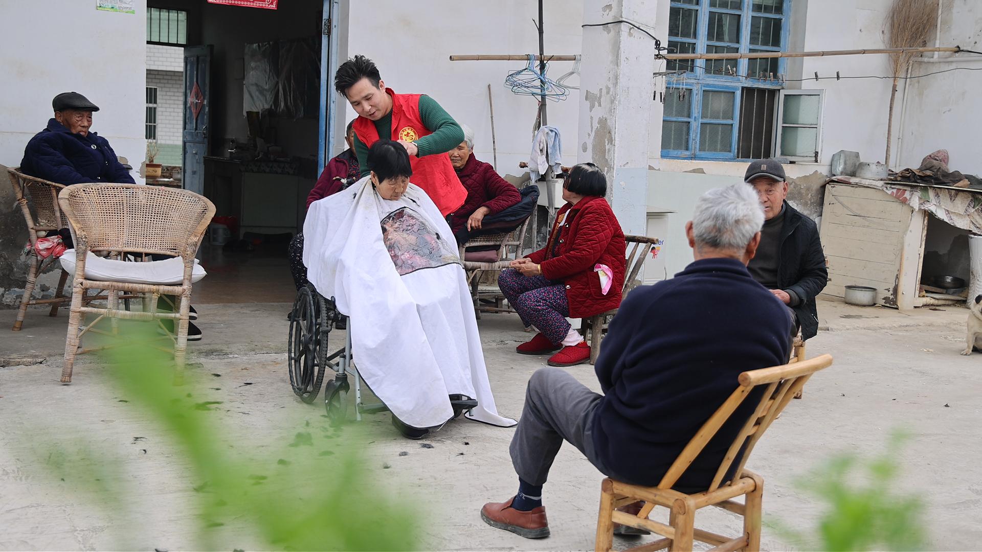 理发店越到周末生意越好。几年前,在梅渚镇上,所有的理发店老板们约定,每周一是大家统一休息的时间,徐金木却有些闲不下来。“我也不会打麻将,没什么别的爱好,在家休息的时候就看看电视、刷刷手机,感觉没什么意思。”徐金木说,2022年,他在社交平台上看到外地有理发师免费到村里给老人剪头发,他就想到,自己是不是也可以这么干?