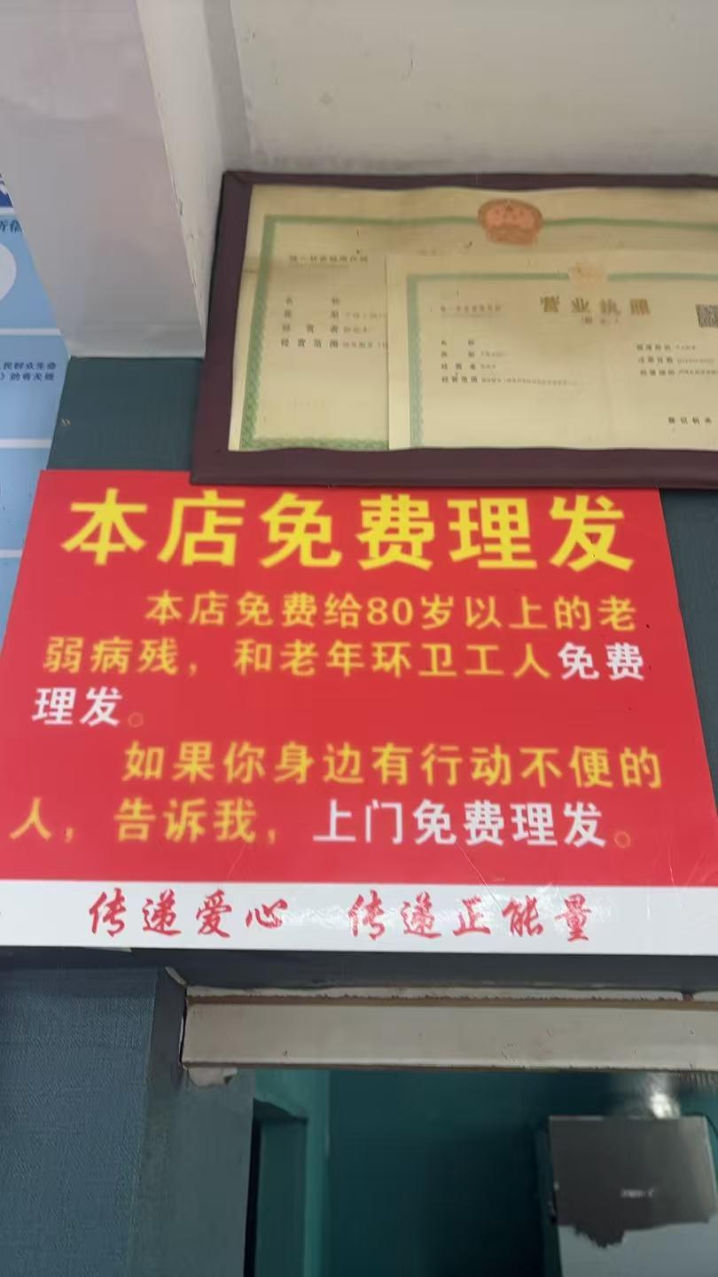 40岁的徐金木年轻时就成了一名理发师,早年在外地工作,2014年,28岁的他回到了安徽郎溪老家,在梅渚镇上开了一家理发店。“生意还不错,开店没有多长时间,我店里就定了一个规矩,镇上80岁以上的老人、老年环卫工人、残疾人来理发都免费。” 徐金木说,这样的免费政策一直延续至今。
