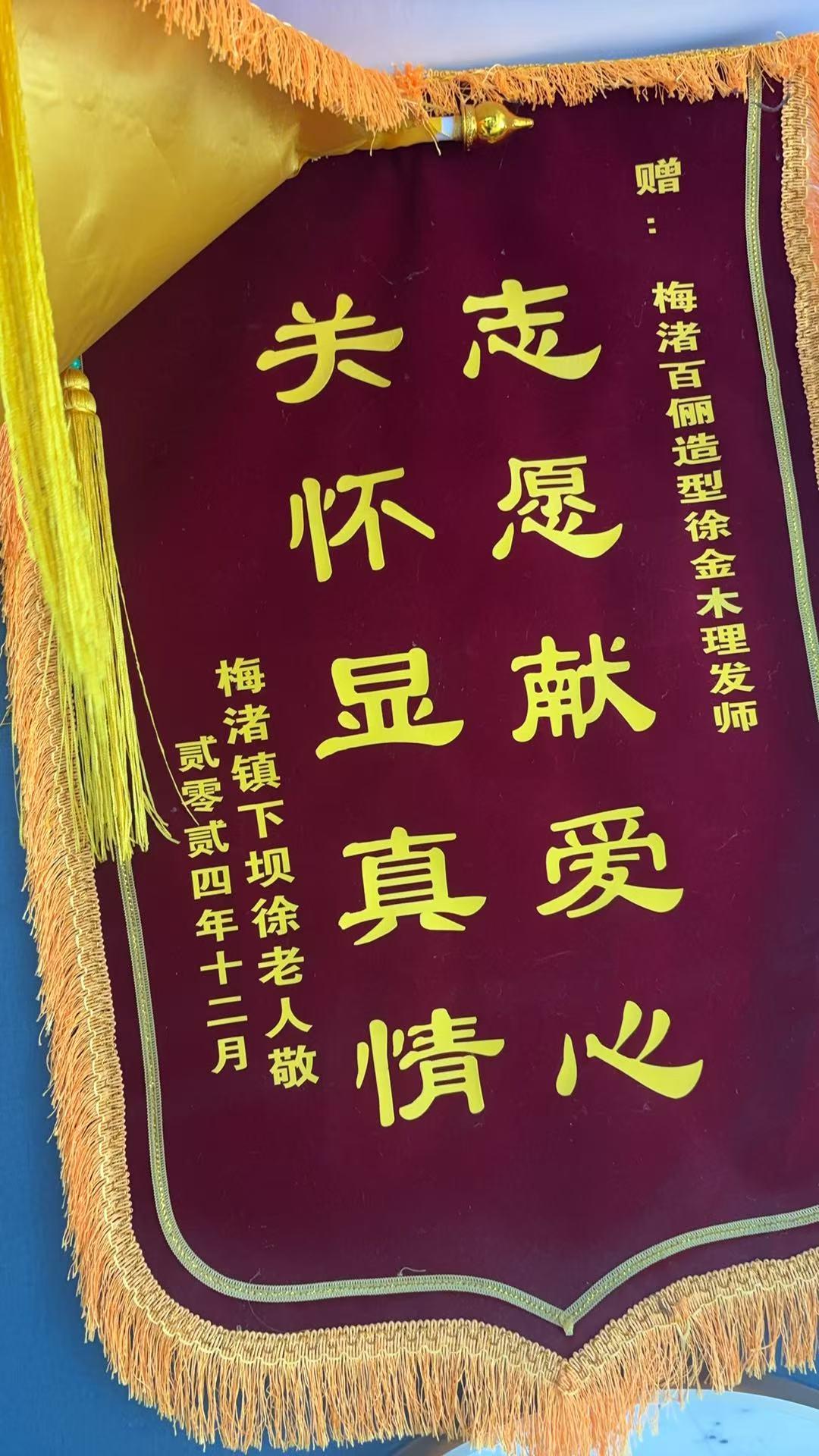 “志愿献爱心,关怀显真情。” 在徐金木的理发店里,挂着几面由村里的老人们送来的锦旗。他说,这些年来,他大概去过县里四五十个村子,服务的老人大约已有几千人次。