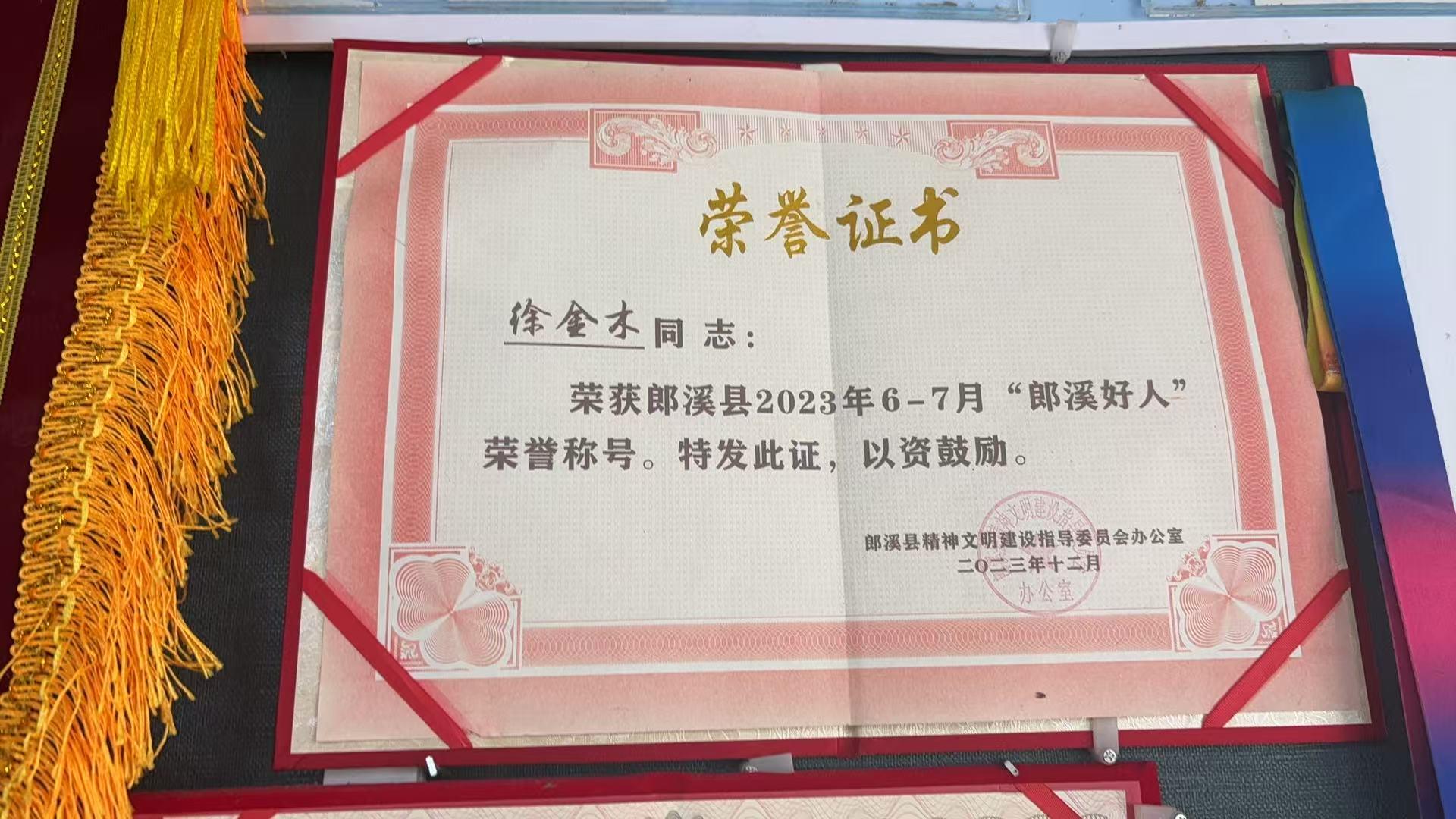 2023年,徐金木荣获“郎溪好人”荣誉称号