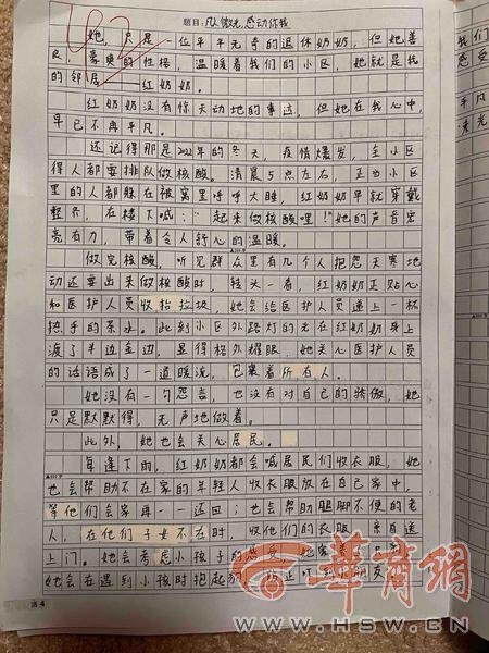 记者看到,刘茜宇这篇作文的题目是《凡人微光 感动你我》,作文中写道:“她,是一位平平无奇的退休奶奶,但她善良、豪爽的性格,温暖着我们小区,她就是我的邻居,红奶奶。红奶奶没有惊天动地的事迹,但她在我心中,早已不再平凡。”
