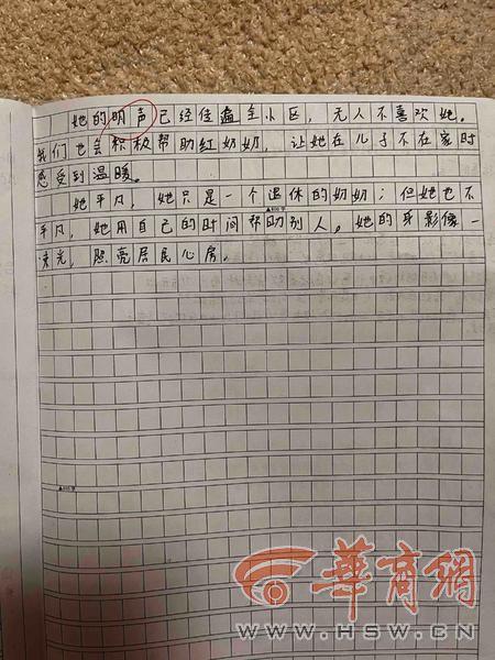 “我看到孩子作文里写的是小区的热心人红奶奶,我觉得孩子对生活观察入微,而且懂得感恩,这一点,她一个十来岁的孩子,比成年人做得更好。”马女士说,这篇作文是孩子的一篇考试作文,她无意中看到了,她还问了孩子,为什么会写红奶奶?孩子说,她看到这个作文题,一下子就想到了这个奶奶,也一口气写完了作文,这是她的真情实感。