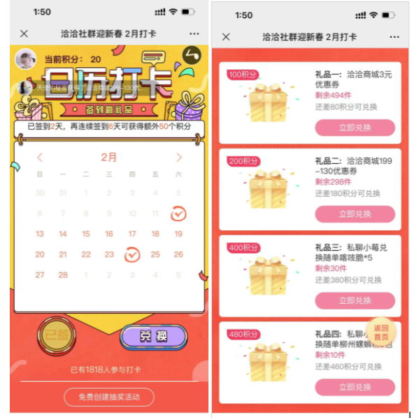 利用凡科互动h5做打卡统计,积分达到一定量,即可兑换相应礼品,激发用户参与热情。
