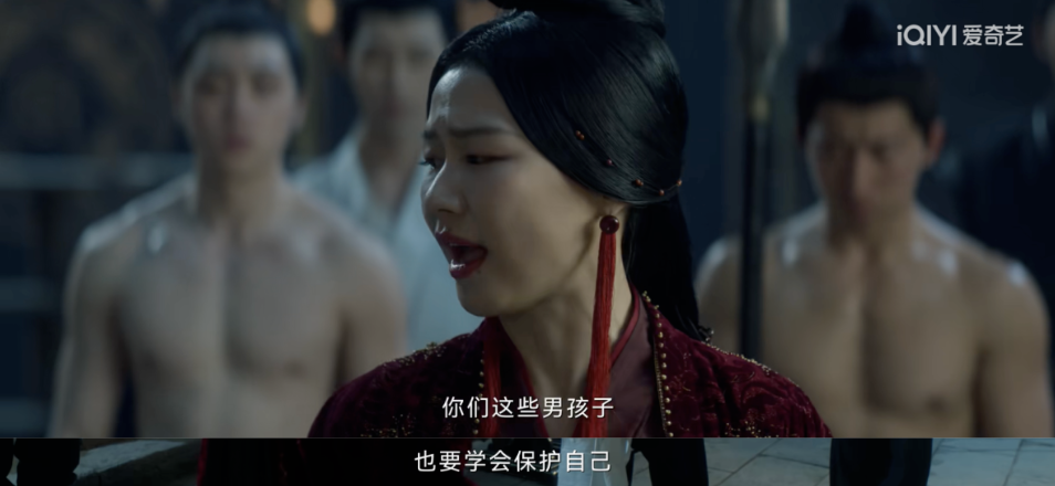 还加入了喜剧人物,也就是金靖这个角色,可以对照《小时代》里的唐宛如,开场就闯进侍卫休息区,在一群光着膀子露身材的侍卫中间说着“你们这些男孩子,也要学会保护自己,知道吗。”