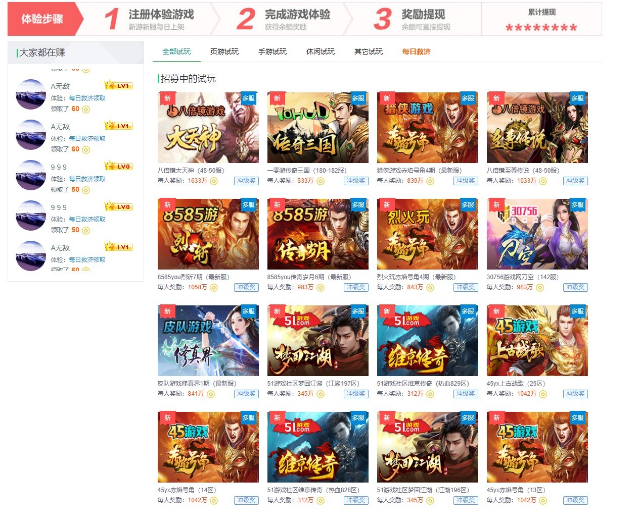 用户可以通过参与游戏试玩、竞猜游戏、广告体验、积分兑换、
