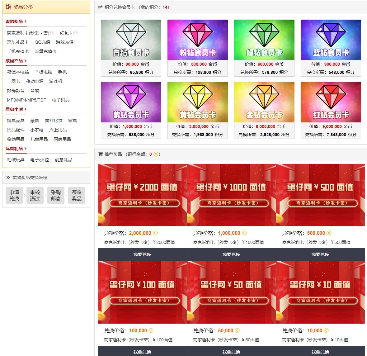 员可以在兑奖商城用积分兑换定额的钻石会员卡,积分获取途径可通过玩游戏,签到,活跃度等获得。