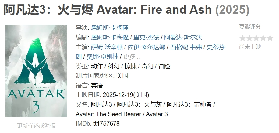 影片由萨姆·沃辛顿、佐伊·索尔达娜等主演,预计于2025年12月19日在北美上映。故事背景设定在阿凡达星球,人类与纳美人之间的战争再度升级,超级战舰抵达,人类投下氧气弹,阿凡达星球面临前所未有的危机,一场震撼人心的战斗即将展开。