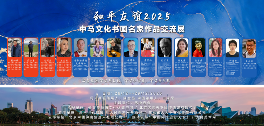 参展艺术家阵容强大,中方包括来自中国美术家协会、相关画院及学术机构的资深书画家中国民族文化促进会会员、包头书法家协会名誉副主席戴炳麟;中国美术家协会会员、国家一级美术师、中国民族画院画家、内蒙古中国画学会理事茹少军;西安聚雅轩副院长高利生;内蒙美术家协会会员王义英等;马方则汇聚了多位艺术界代表人物,如东方国际理工学院创办人、联合政府秘书处主任达托·万·诺尔·阿卡伊拉、拿督陆景隆、林国安、李业祥、孔万良、方宝玉、陈莲莲、吴君燕、许秀如、林奕彤、王金吉等,以及马六甲书艺协会、马来西亚国际联盟等艺术团体的会员名家。作品题材丰富,形式多样,既有传统水墨的深远意境,亦融合现代审美与本土风情,生动诠释了“和平友谊”的主题。