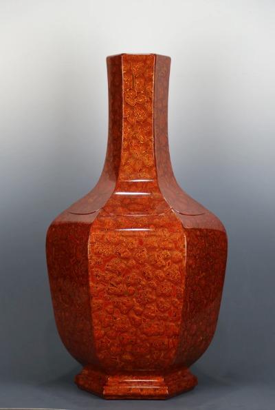 漆器《六合承平》品名:红金斑犀皮漆六方瓶,高68.8厘米、腹径38.0厘米。“六合承平”是由“六合”(庄子.齐物论)和“承平”(汉书.累世承平)组合演化而来,常用来赞美国家繁荣稳定,体现了中国文化中对“大一统”太平治世的理想追求。本作品样式取自清代雍正时期宫廷陈设的“六方大瓶”器型。全器雄浑高大、尊贵稳重,由上而下划作六方,寓意“东西南北天地”六方平安,故取名“六合承平”。