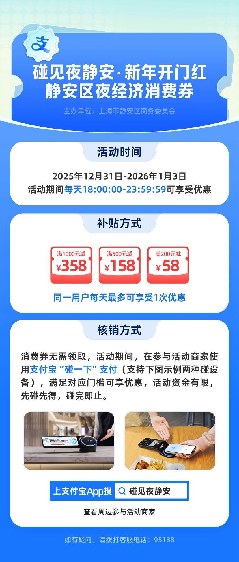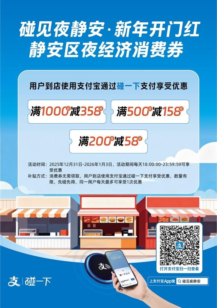 2025年12月31日——2026年1月3日连续4天,每晚18:00-24:00静安限时投放支付宝“碰一下”满减消费券,真金白银迎元旦!餐饮、零售、美妆、运动潮流全品类覆盖,不管是美食打卡还是逛街扫货,都能享受满立减活动,这波2026开年福利千万别错过!