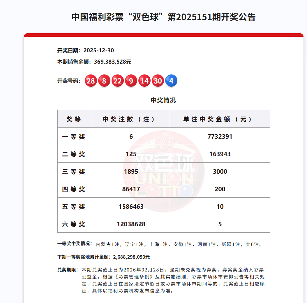 大皖新闻讯 12月30日,中国福利彩票“双色球”第2025151期中奖号码公布。当期开出6注一等奖,单注中奖金额7732391元。