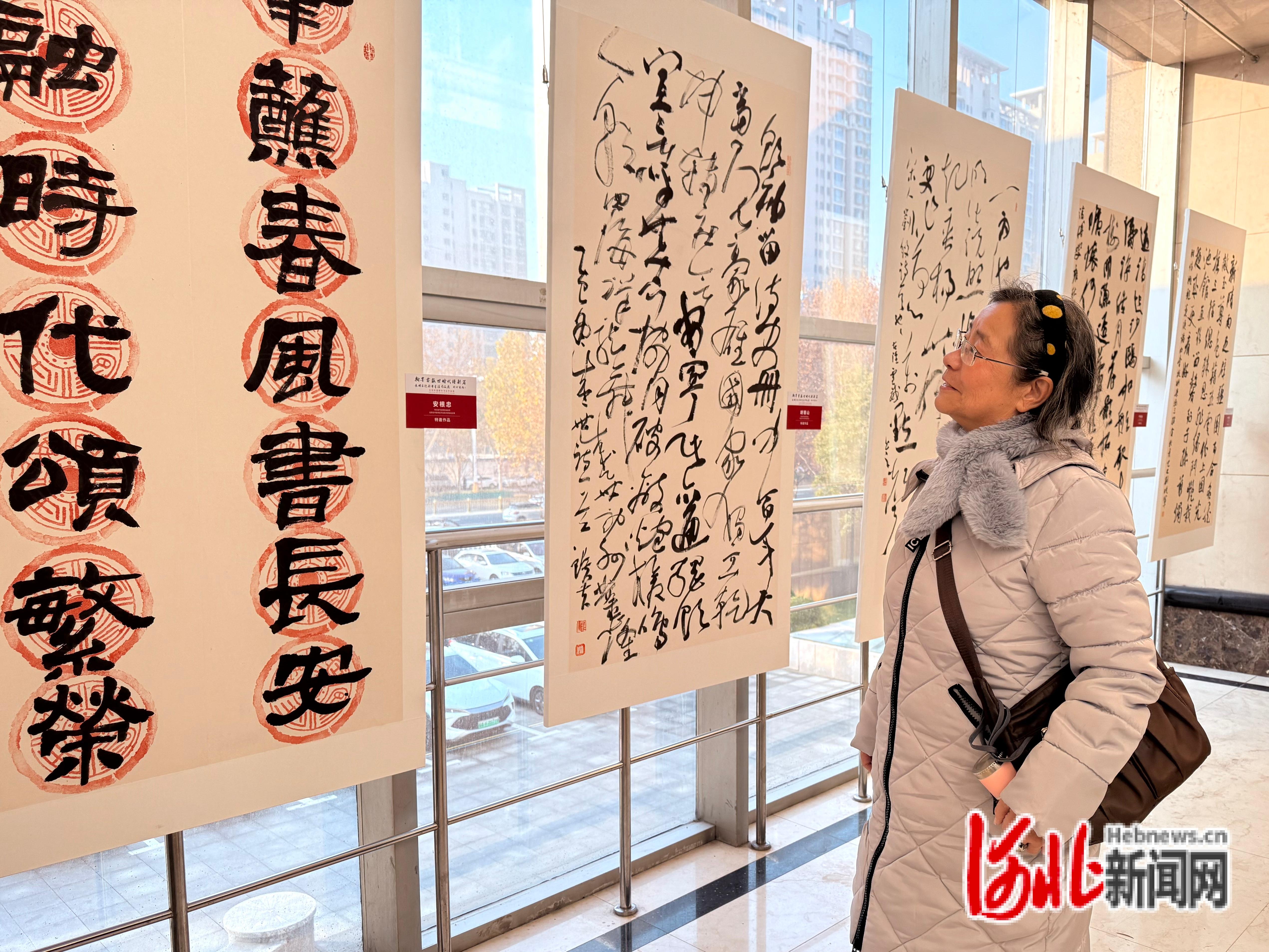 12月30日,石家庄市长安区“翰墨书盛世时代谱新篇”迎新年书法作品展,书法爱好者正在欣赏作品。河北日报见习记者侯淼摄