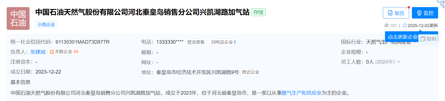 天眼查平台信息显示,中国石油天然气股份有限公司河北秦皇岛销售分公司兴凯湖路加气站成立于2023年12月,位于秦皇岛市经济技术开发区兴凯湖路9号。