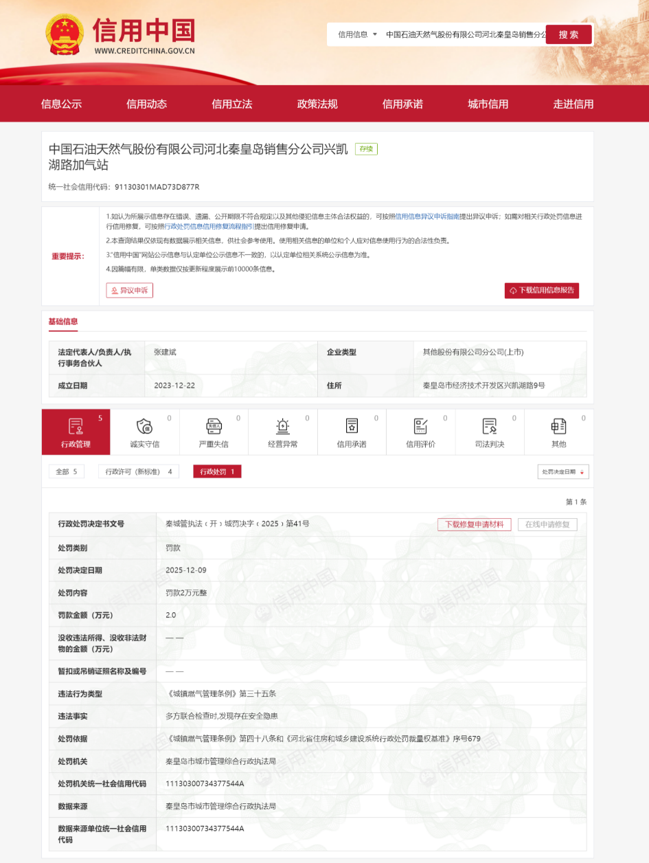 行政处罚决定书显示,2025年,在一次多方联合检查中,秦皇岛市城市管理综合行政执法局发现中国石油天然气股份有限公司河北秦皇岛销售分公司兴凯湖路加气站存在安全隐患。